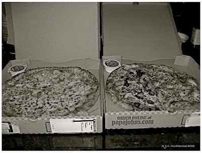 Bob: I know. Different, right? Originally, I was going to post these photos in color, but B&W was so much more interesting, because it's not what you expect for a picture of pizza. That said, it will go well with the interpretations others have contributed this week.